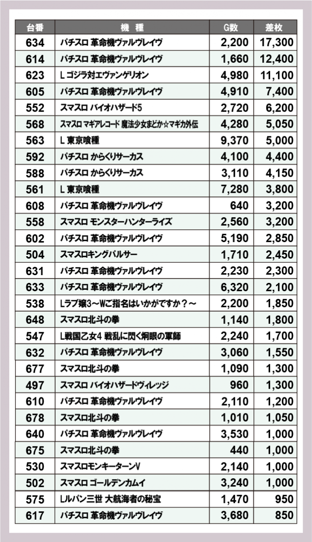 ※差枚数順に掲載しています