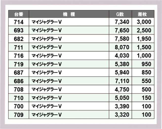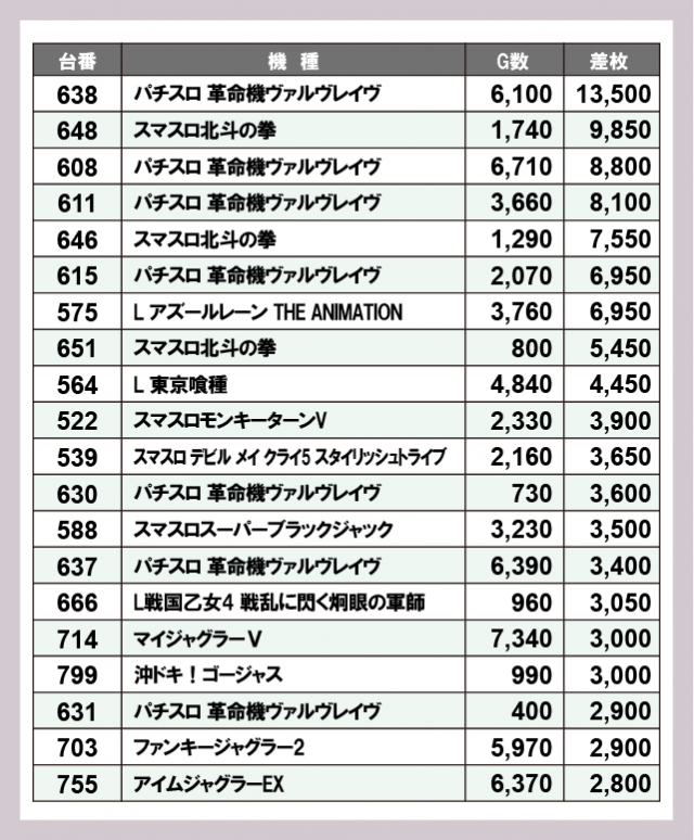 ※差枚数順に掲載しています