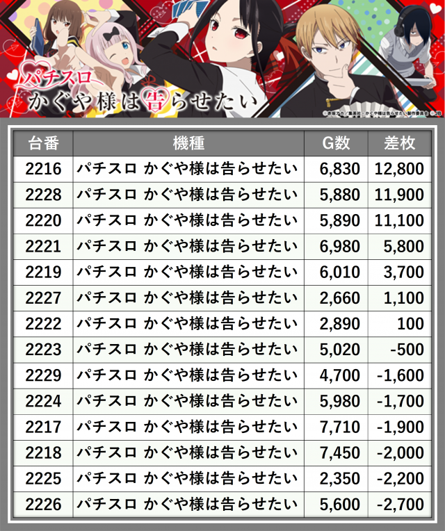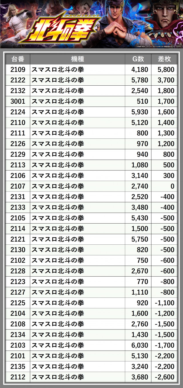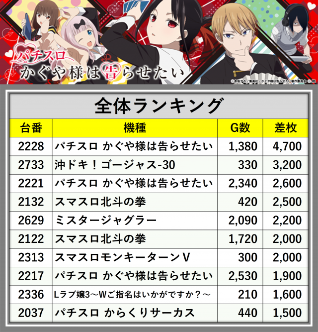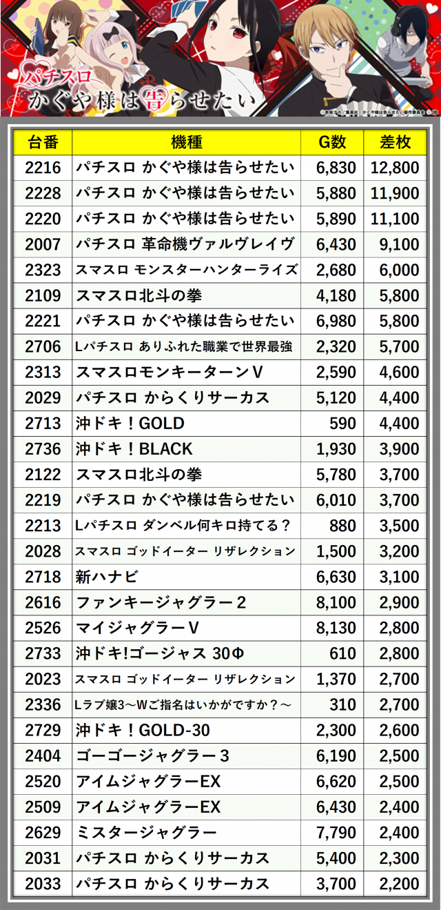※差枚数順に掲載しています