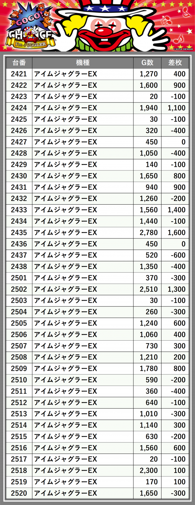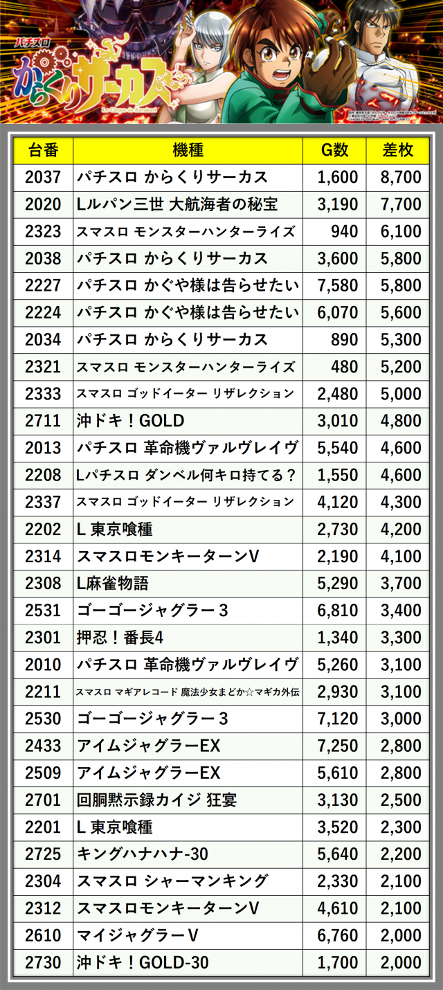 厳選された取材対象機種をはじめ、その他スロット全体から好記録が飛び出した!プレイヤーが楽しんだ1日を下記データにて振り返ってみて欲しい。