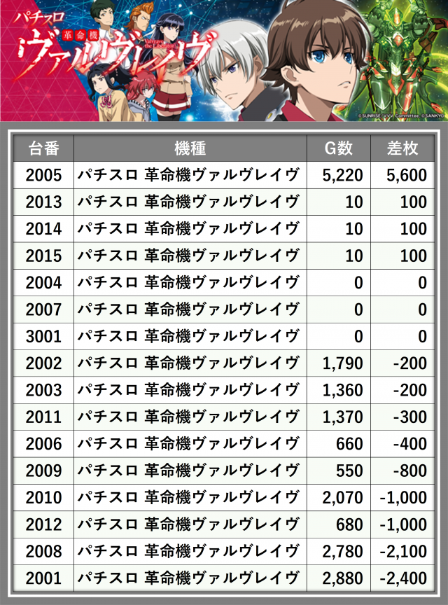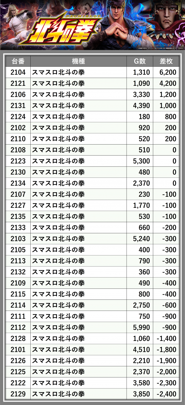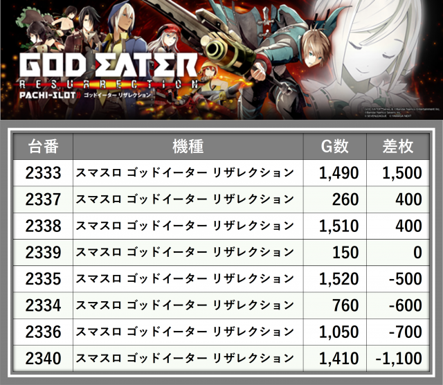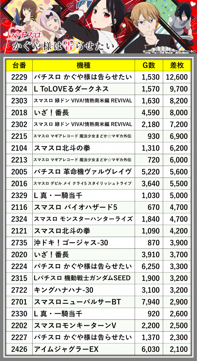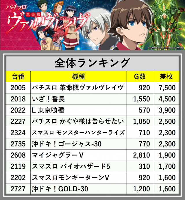 ※差枚数順に掲載しています