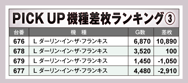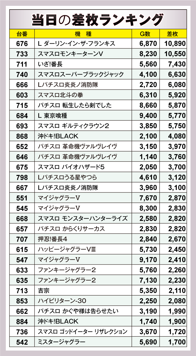 この日、最もプレイヤーの注目を集めたのが導入間もない新台の『L ダーリン・イン・ザ・フランキス』で、676番台が+10,890枚を叩き出しランキングトップに。続く『スマスロモンキーターンV』も万枚超を達成しており、新旧を問わず広範囲に渡ってチャンスが潜んでいたのは間違いないだろう。