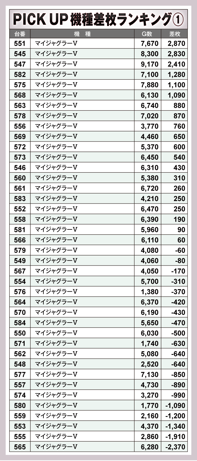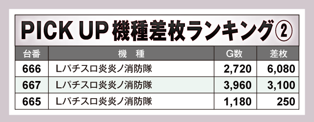 今回のPICK UP機種は全3機種。『マイジャグラーⅤ』と『L ダーリン・イン・ザ・フランキス』は、両機種とも半数の台がプラス差枚で実戦を終える見事な結果を残している。また、『Lパチスロ炎炎ノ消防隊』からは+6,080枚が発生しているだけに、それぞれのシマは常にファンの笑顔と活気に満ち溢れていた。