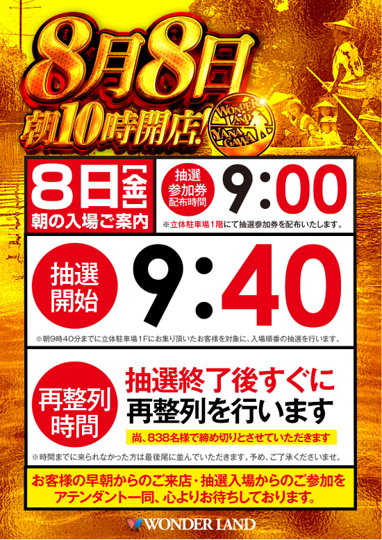 8月8日 ワンダーランド柳川店★ 十時開店★抽選9:40