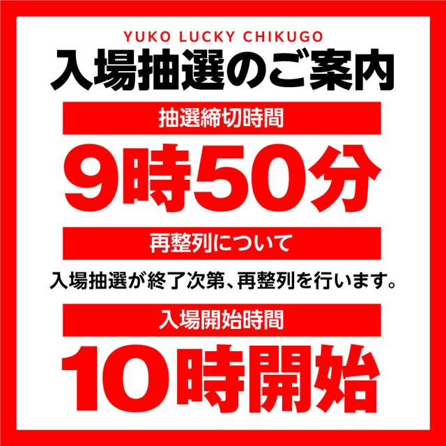 駐輪場近くの入口にて、あさ9時50分までにお集まり頂いた方を対象に抽選致します。抽選後すぐに再整列となります。 |