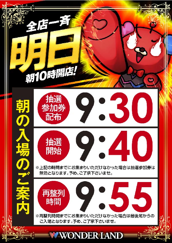 朝の入場順番を決める抽選は9時40分締切、再整列9時55分締切です。 |