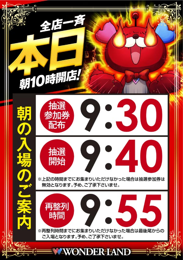 朝の入場順番を決める抽選は9時40分締切、再整列9時55分締切です。 |