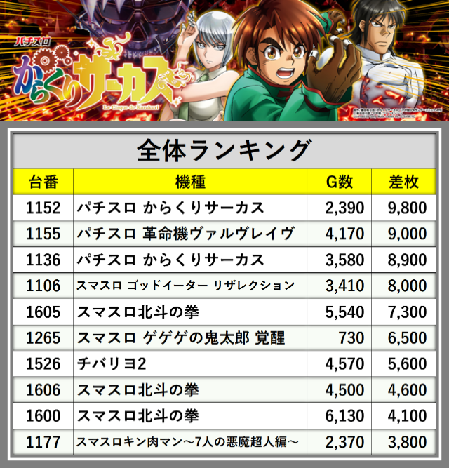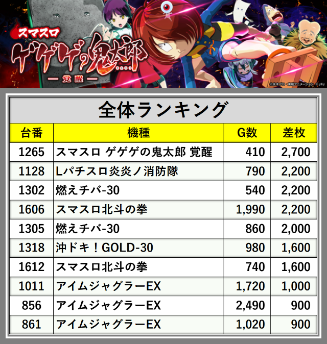 厳選された取材対象機種をはじめ、その他スロット全体から好記録が飛び出した!プレイヤーが楽しんだ1日を下記データにて振り返ってみて欲しい。
