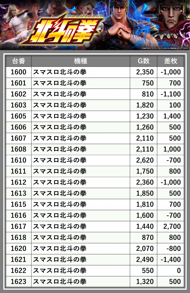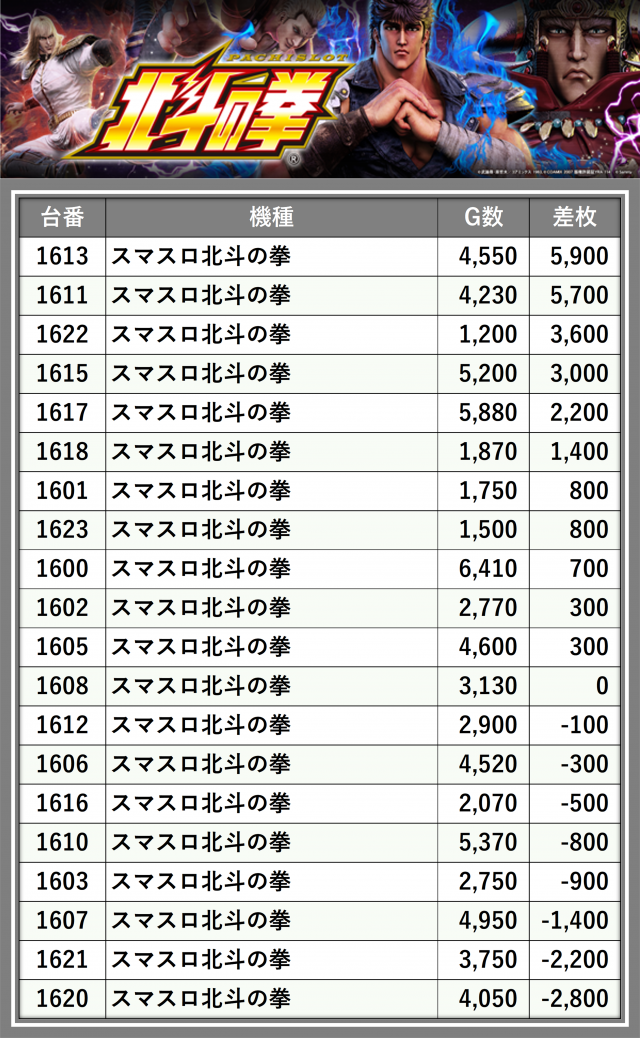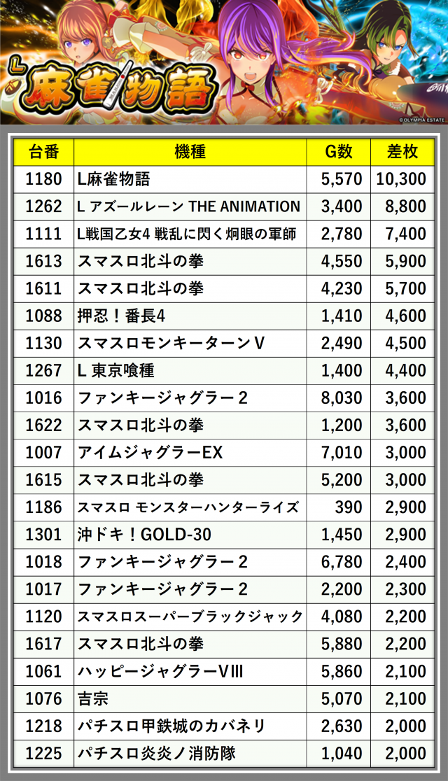 ※差枚数順に掲載しています