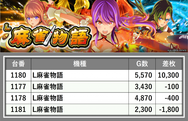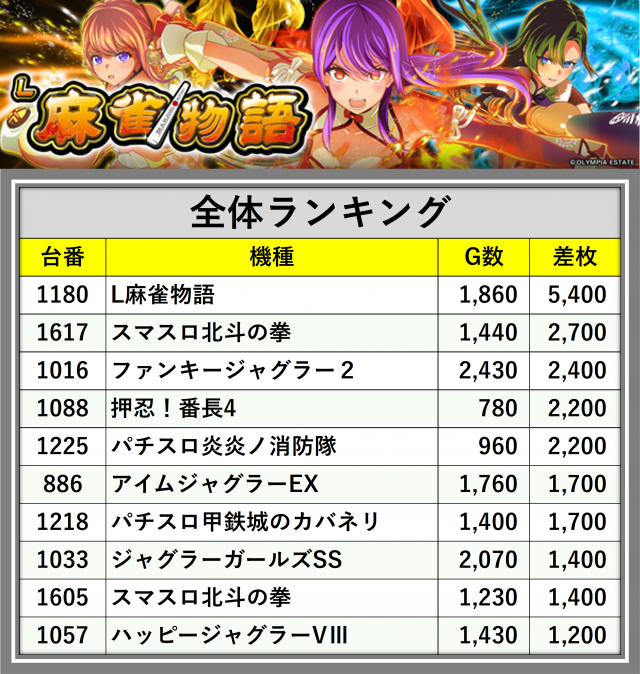 厳選された取材対象機種をはじめ、その他スロット全体から好記録が飛び出した!プレイヤーが楽しんだ1日を下記データにて振り返ってみて欲しい。