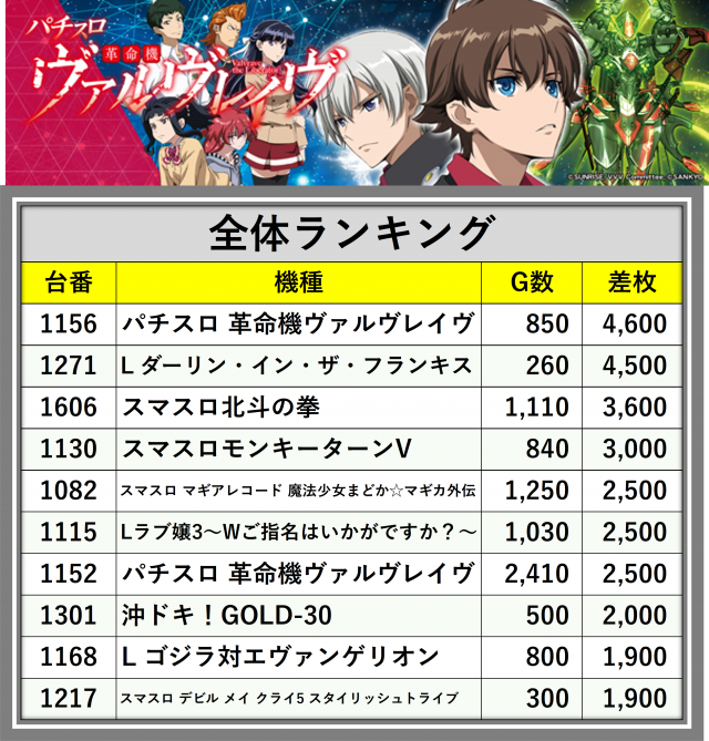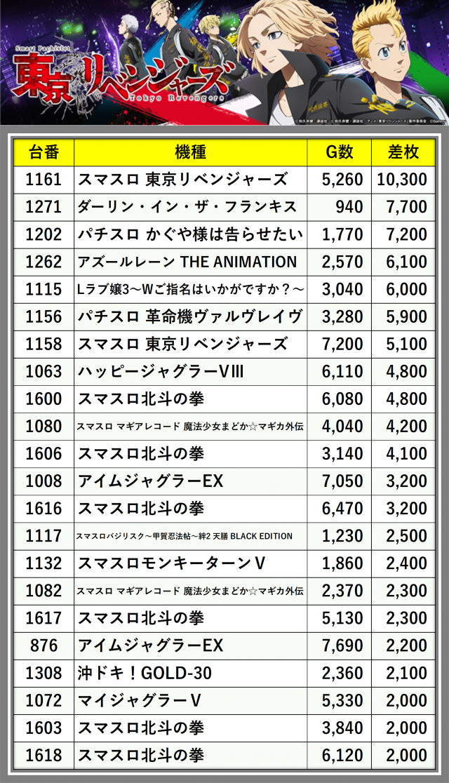 ※差枚数順に掲載しています