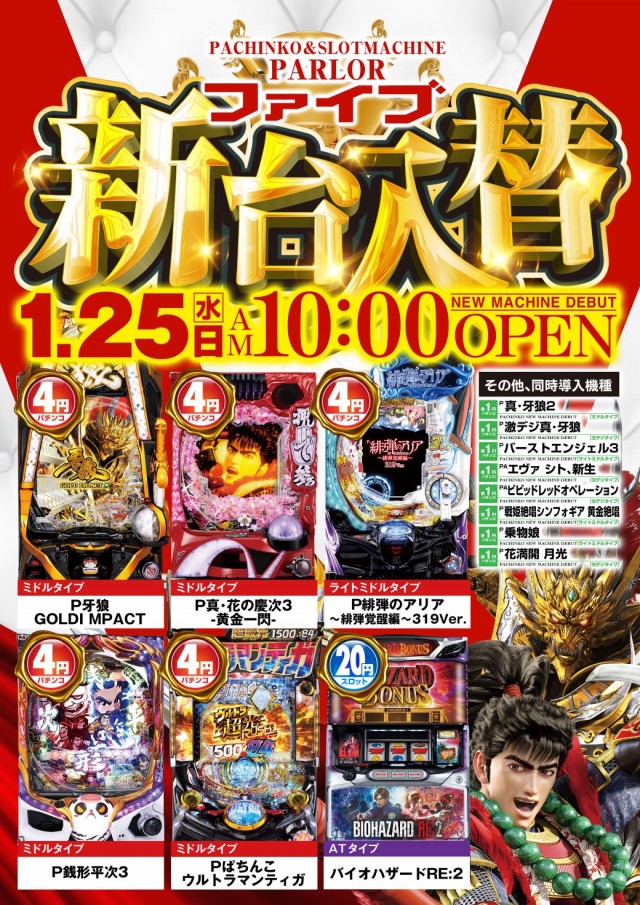 1.111円パチンコ:108台 4円パチンコ:72台 6.25円スロット:36台 20円スロット:72台 |