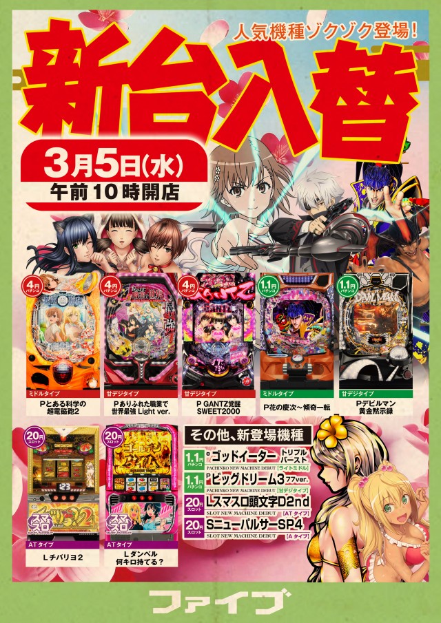 1.111円パチンコ:108台 4円パチンコ:72台 6.25円スロット:36台 20円スロット:72台 |