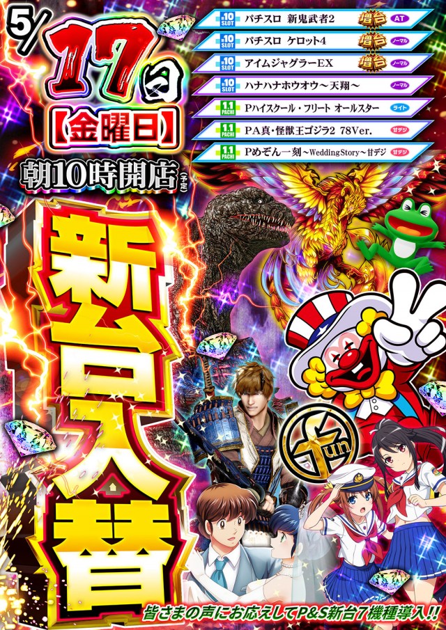 明日、店休日。5月17日新台入替10時開店!!