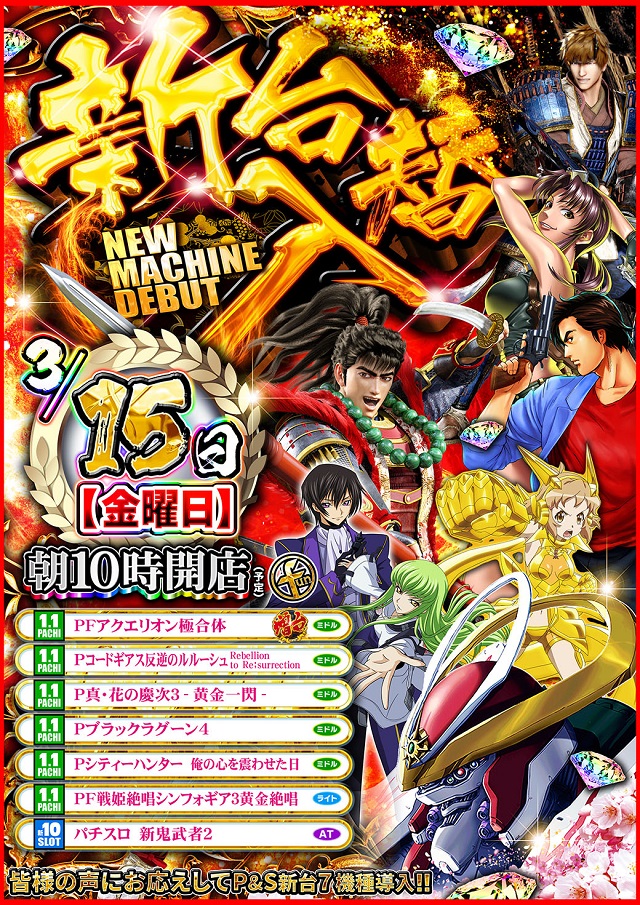 明日、店休日。3月15日新台入替10時開店!!