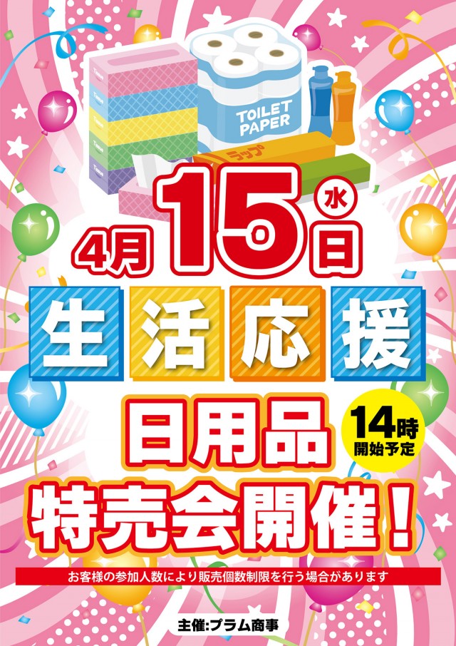 本日 4月 15日(水)『日用品特売会開催!』10時開店!