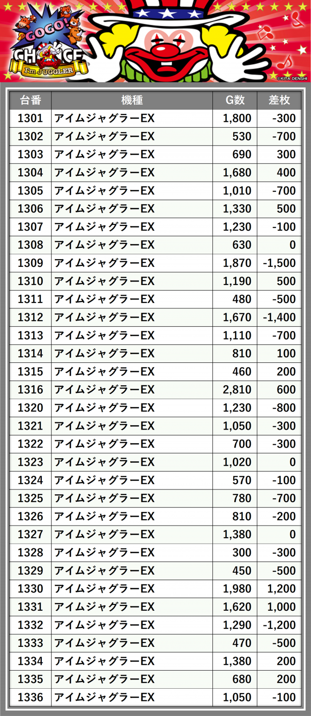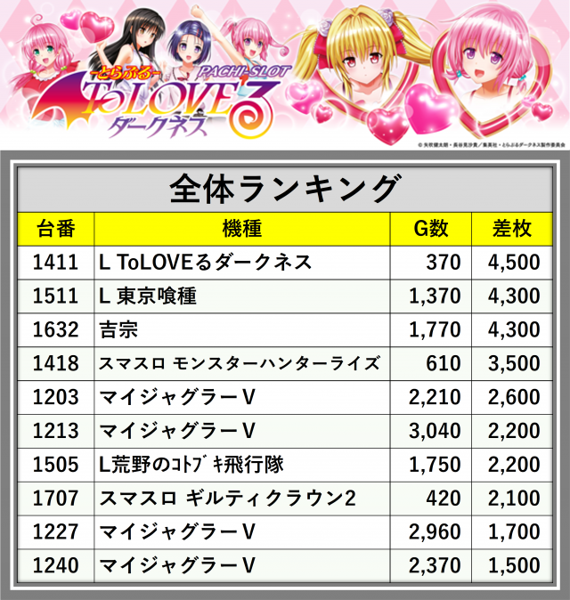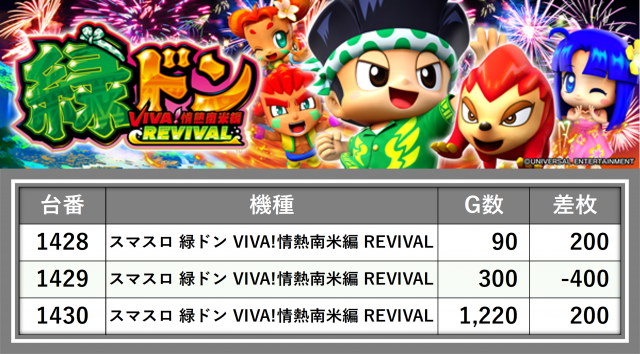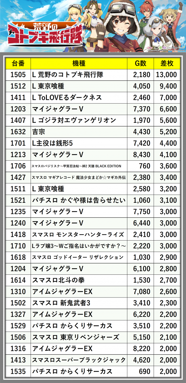 厳選された取材対象機種をはじめ、その他スロット全体から好記録が飛び出した!プレイヤーが楽しんだ1日を下記データにて振り返ってみて欲しい。