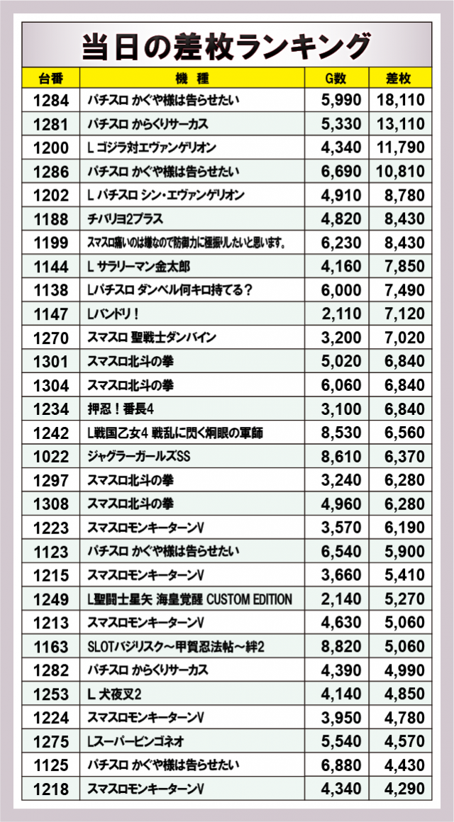 スマスロ機を筆頭に盛り上がりをみせており、『パチスロ かぐや様は告らせたい』『パチスロ からくりサーカス』『L ゴジラ対エヴァンゲリオン』から計4台の万枚OVERという熱気が放たれていた。さらに『L パチスロ シン・エヴァンゲリオン』『チバリヨ2プラス』『スマスロ痛いのは嫌なので防御力に極振りしたいと思います。』で8,000枚OVER、その他まとまった出玉を獲得する台が多数出現!TOP30台は4,000枚OVERからとなっていることも館内の熱量を窺える内容となっており、遊技するファンは胸を躍らせ、有意義な時間を過ごしていたことだろう。
