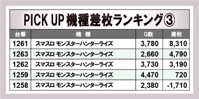 上表の5機種は活気と熱気に溢れており、当日の店内の盛り上がりをリード。特筆すべきはどの機種も4桁差枚を多数放出している所で、スマスロ人気機種としての圧倒的存在感を示し、安定したパフォーマンスでファンは満足度の高い1日を過ごしていたのは確かだろう。