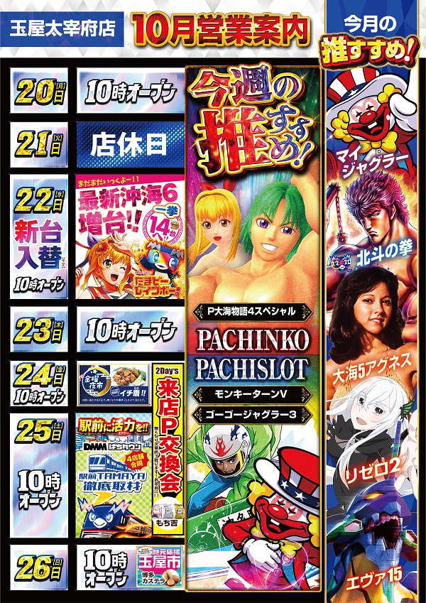 8月30日、「玉屋太宰府店」「玉屋409雑餉隈」「玉屋∞室見」「玉屋555大橋」の4店舗にて『駅前TAMAYA徹底取材』が合同実施された。当日の店内は多くの人たちが集まり大盛況で、『ジャグラー』シリーズを中心に良台が店内のアチコチに出現してい…