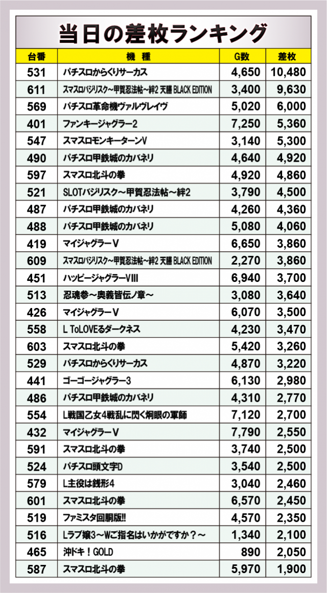 『パチスロからくりサーカス』から万枚OVER、『スマスロバジリスク~甲賀忍法帖~絆2 天膳 BLACK EDITION』から万枚未遂台や『パチスロ革命機ヴァルヴレイヴ』から+6,000枚OVERをマーク。また、『ファンキージャグラー2』401番台・+5,360枚を筆頭に『ジャグラー』シリーズや、『パチスロ甲鉄城のカバネリ』『SLOTバジリスク~甲賀忍法帖~絆2』などのメダル機も奮闘しており、チャンスは至る所に存在していたようだ。