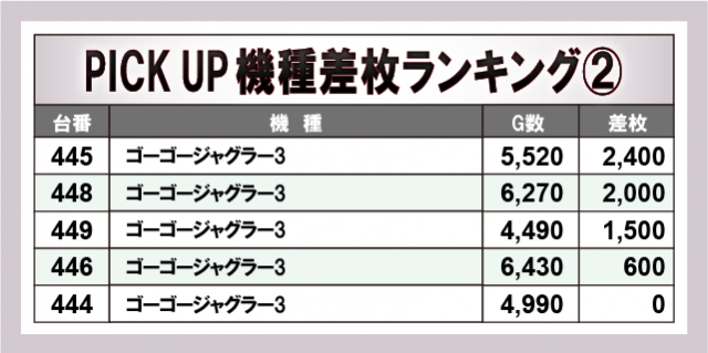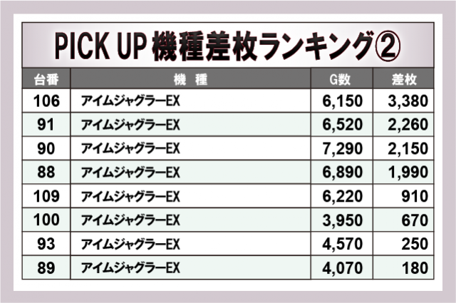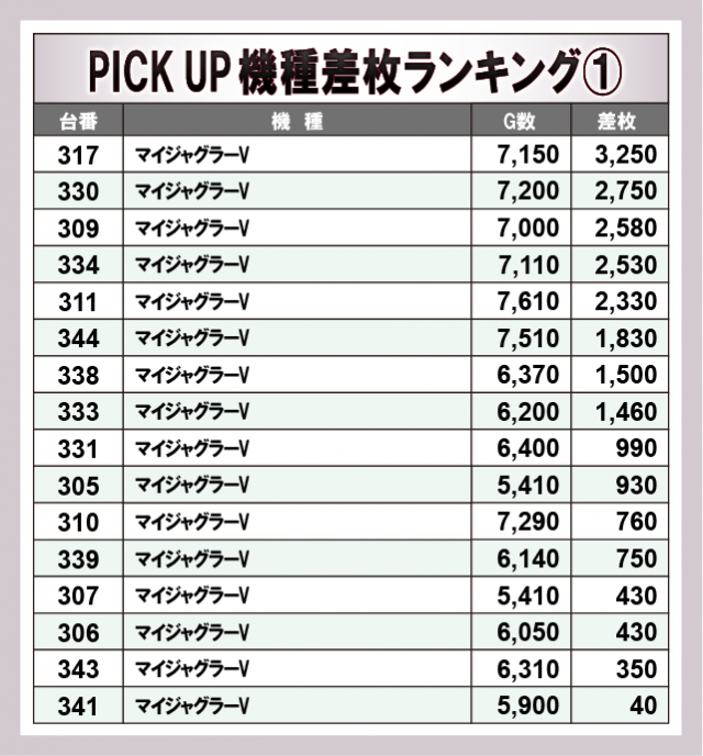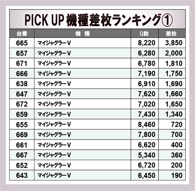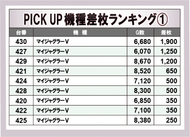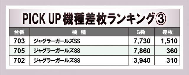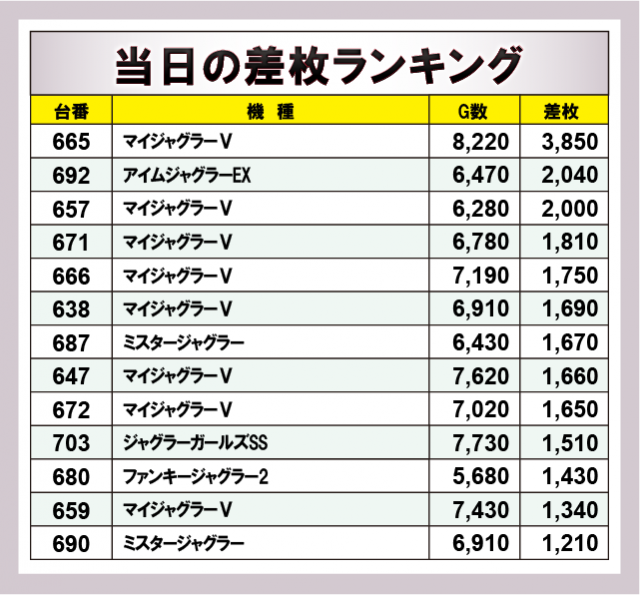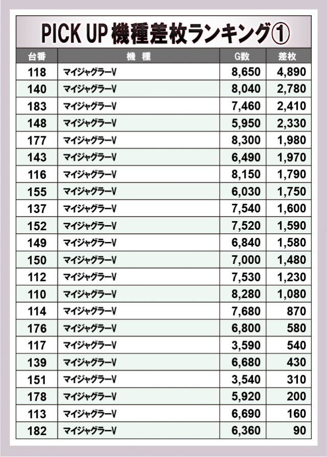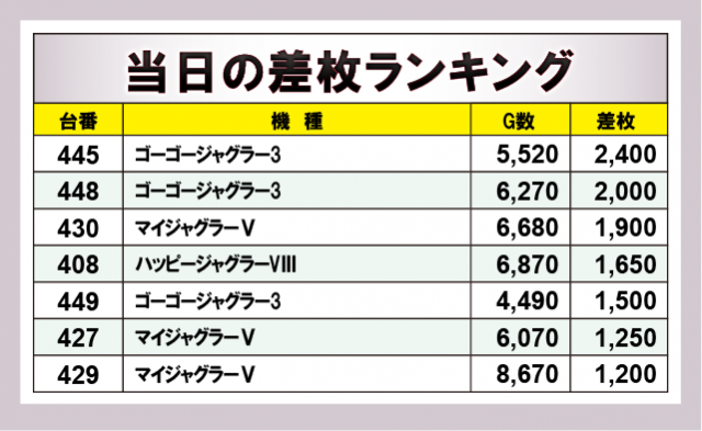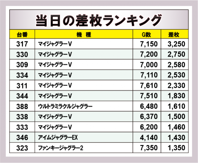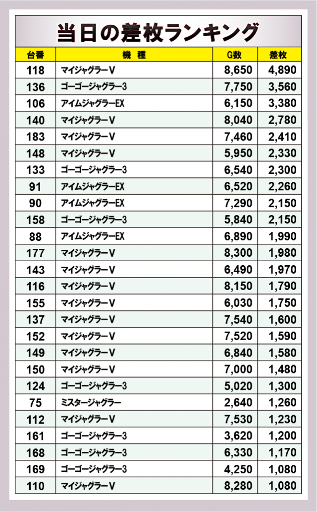 「玉屋室見店」では、突出して目立っていたのが『マイジャグラーⅤ』で、2,000枚OVER台が5台発生。回転数と差枚数が比例する展開を披露し、安定した差枚となっているのは流石のひと言に尽きる。