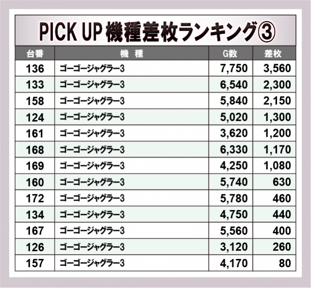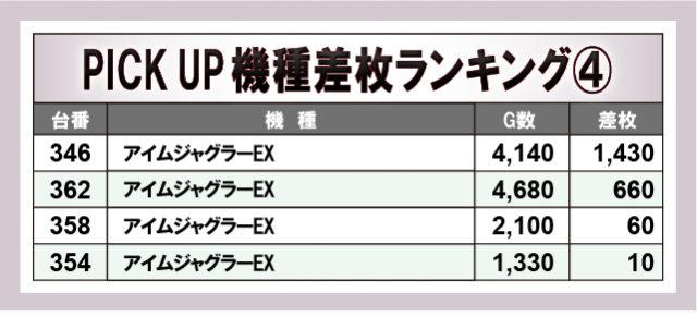 「玉屋409雑餉隈」では前回同様、設置台数の多い『マイジャグラーⅤ』『アイムジャグラーEX』『ゴーゴージャグラー3』からまとまった出玉を確保する台を多数確認!前者の『マイジャグラーⅤ』では+5,000枚に届く勢いをみせ、ジャグラー侮りがたしと言えよう。