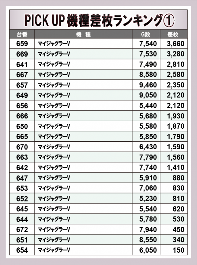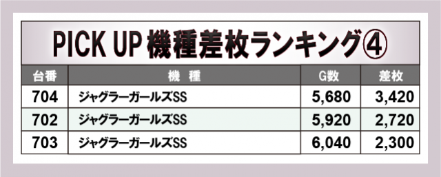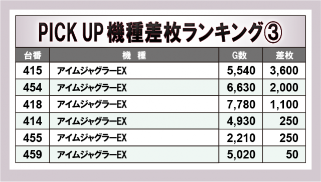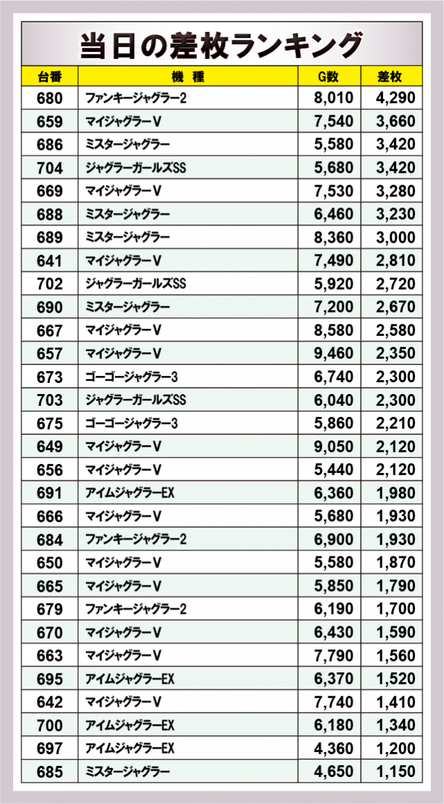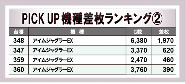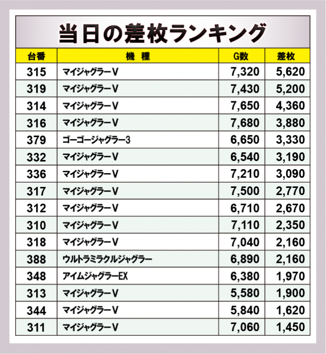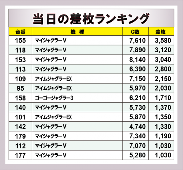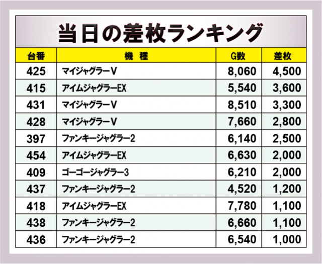 「玉屋太宰府店」では、『マイジャグラーⅤ』で4,000枚OVERが飛び出せば、『ファンキージャグラー2』『アイムジャグラーEX』でも2~3,000枚OVERが発生!ほとんどの台がじっくりと打ち込まれた結果となっており、回転数と差枚数が比例する展開を披露していた。