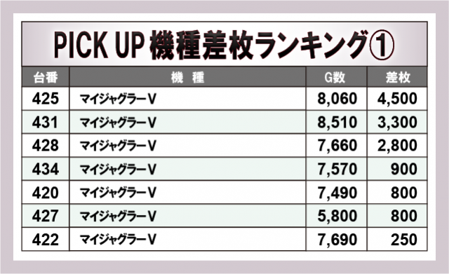 「玉屋409雑餉隈」では突出して目立っていたのが『マイジャグラーⅤ』だ。3台の3,000枚OVERを筆頭に4桁プラス台が多発し、コンスタントなGOGOランプの輝きは、ファンを魅了したに違いない。