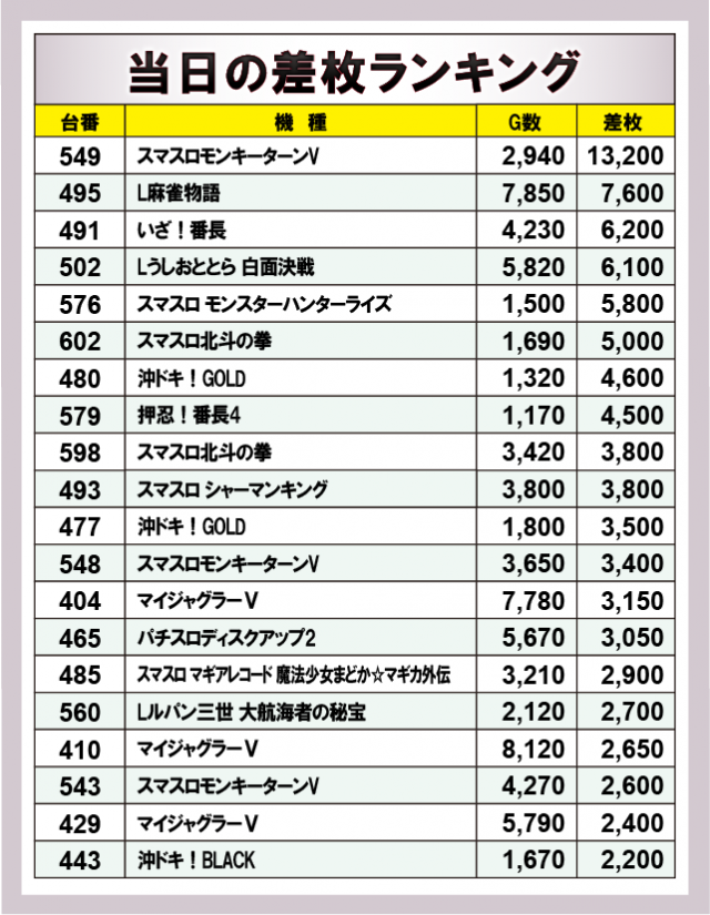 まずは「玉屋太宰府店」全体差枚ランキングの発表だ!