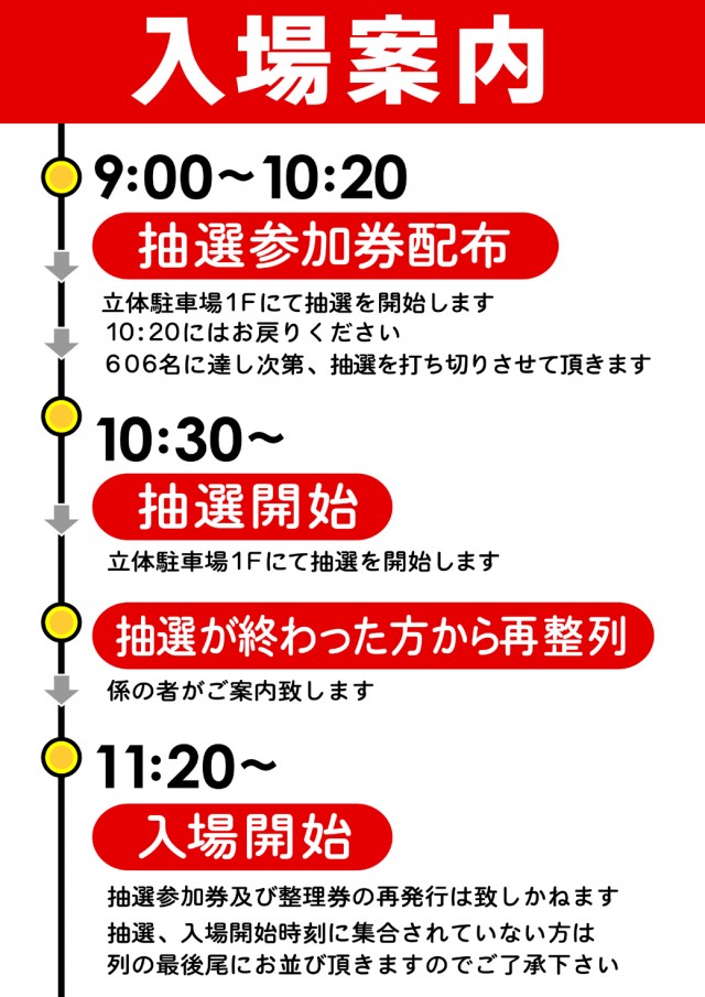 9:00~9:30抽選参加配布(場所:立体駐車場1階)、9:30抽選開始 ※時差オープンの場合は、抽選時間変更有り |
