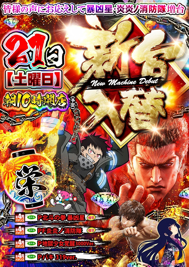 明日、店休日。21日新台入替10時開店!!