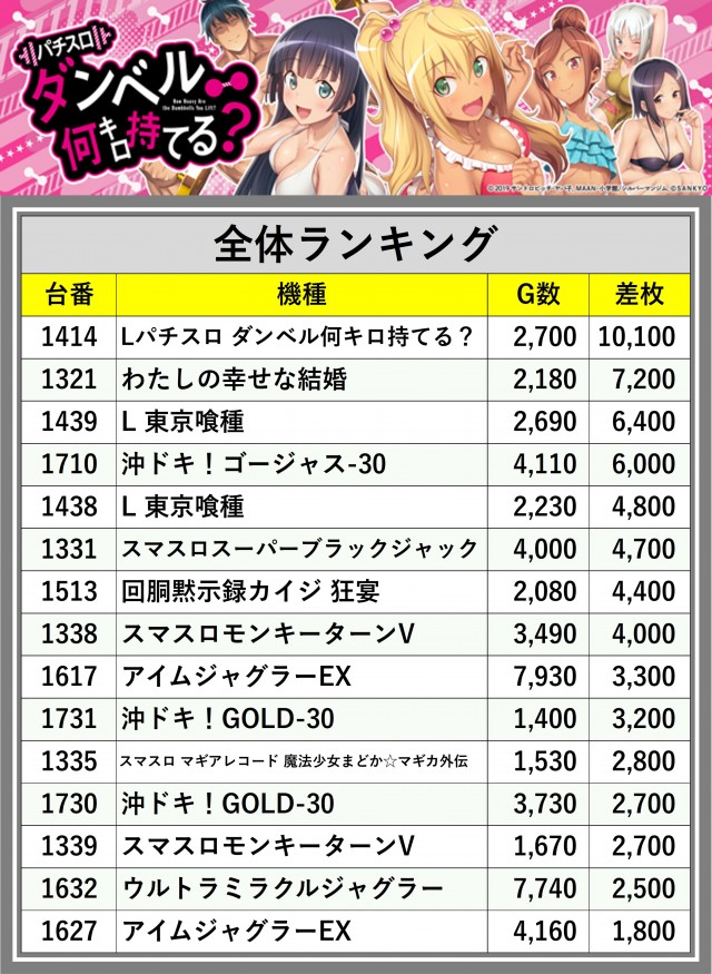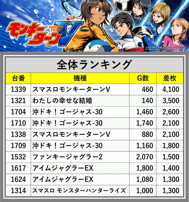 厳選された取材対象機種をはじめ、その他スロット全体から好記録が飛び出した!プレイヤーが楽しんだ1日を下記データにて振り返ってみて欲しい。