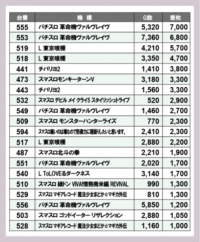 機種別差枚ランキング