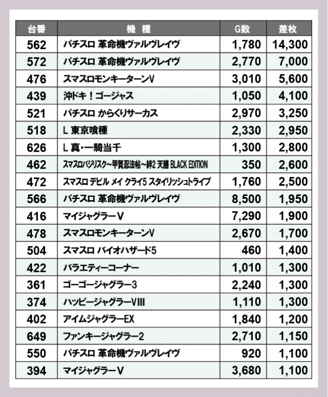 機種別差枚ランキング