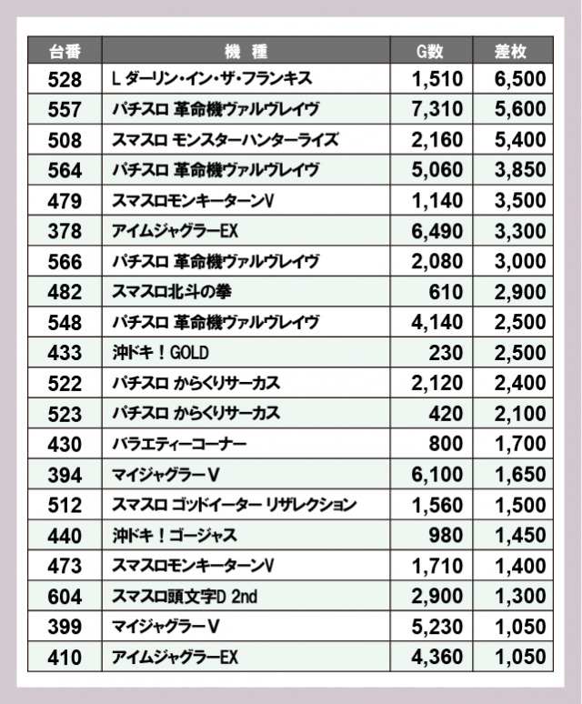 機種別差枚ランキング