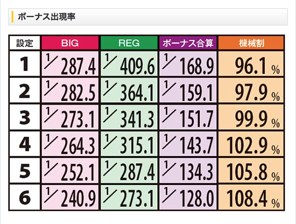 また、ビッグもREG確率ほどではないが、純粋に高設定ほど確率が高いものとなっている。REG確率だけでなく、ボーナス合算確率も参考にし、設定推測の精度を高めたい。