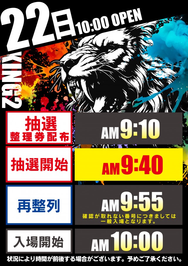 新台入替初日等、一部抽選入場の場合がございます。抽選開始時間は9:40です。 |