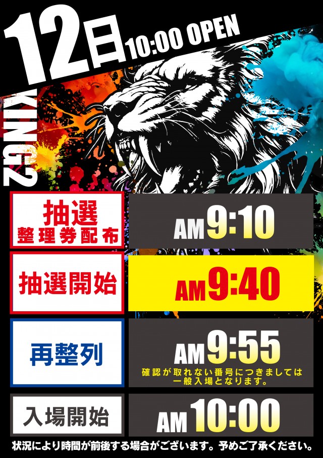 新台入替初日等、一部抽選入場の場合がございます。抽選開始時間は9:40です。 |