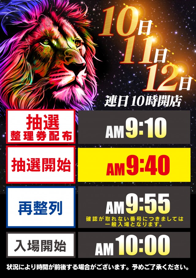 新台入替初日等、一部抽選入場の場合がございます。抽選開始時間は9:40です。 |
