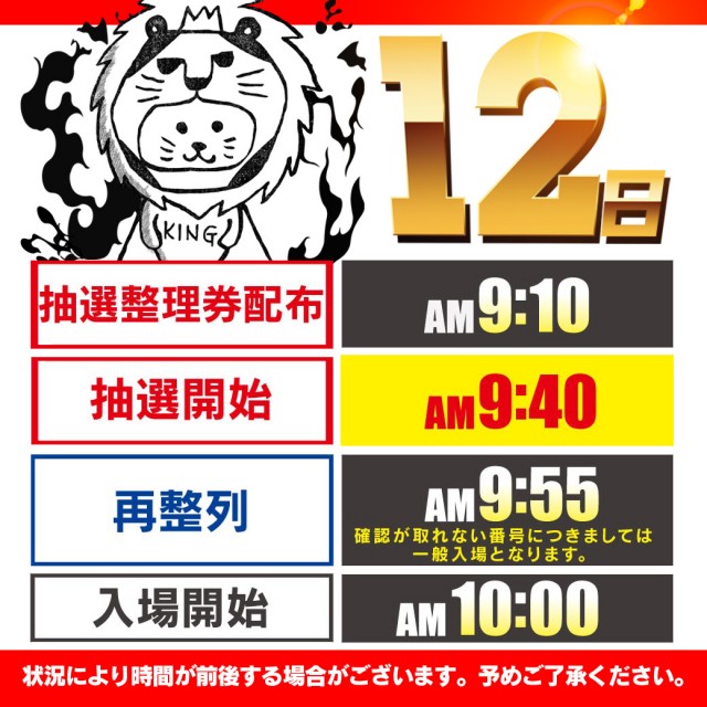 新台入替初日等、一部抽選入場の場合がございます。抽選開始時間は9:40です。 |