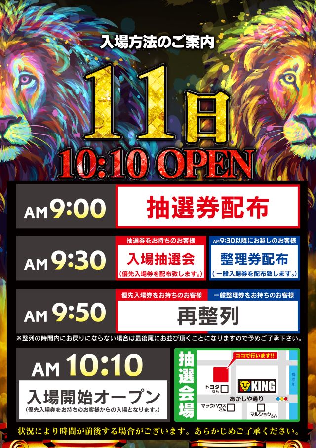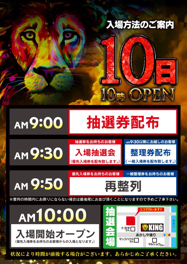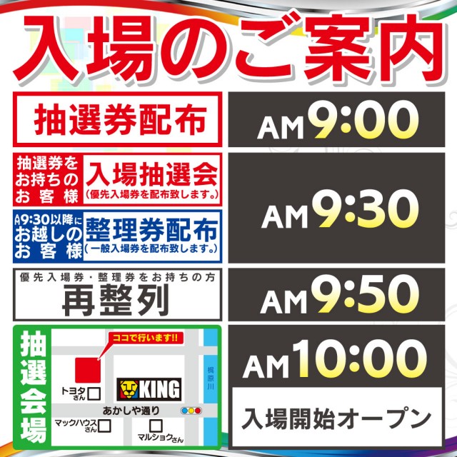 抽選券配布AM9:00/入場抽選会AM9:30/再整列AM9:50※状況により時間が前後する場合がございます。あらかじめご了承ください。 |