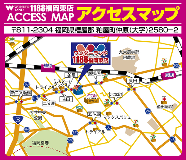 福岡空港から車で約5分!イオン福岡東店横ですので買い物ついでにどうぞ♪ バスでお越しの方は「釜屋・イオン福岡東前」バス停よりすぐ♪ |