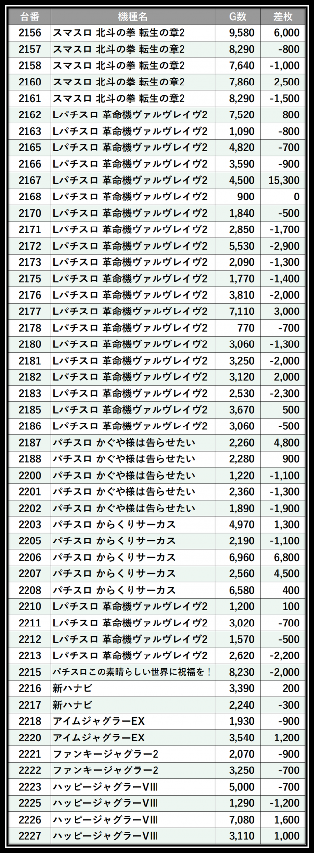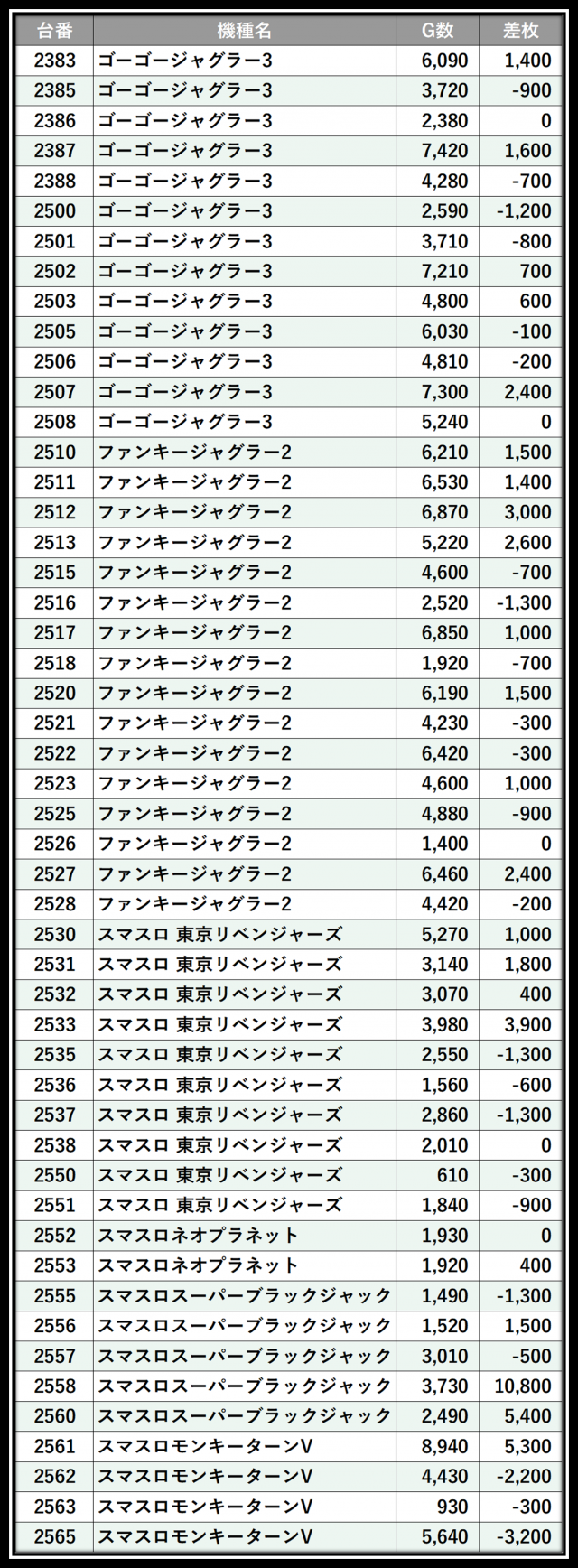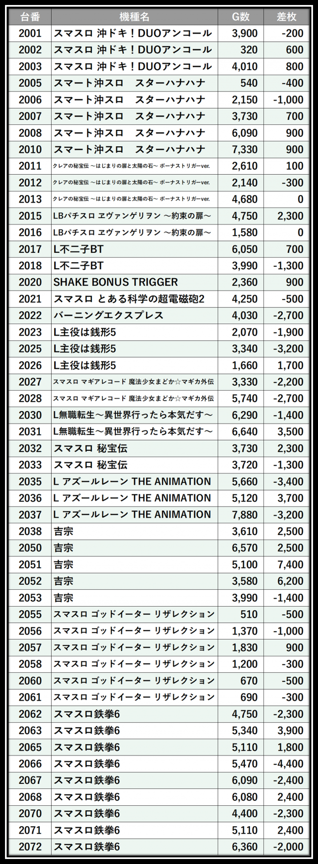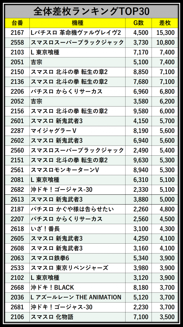 ※差枚数順に掲載しています
