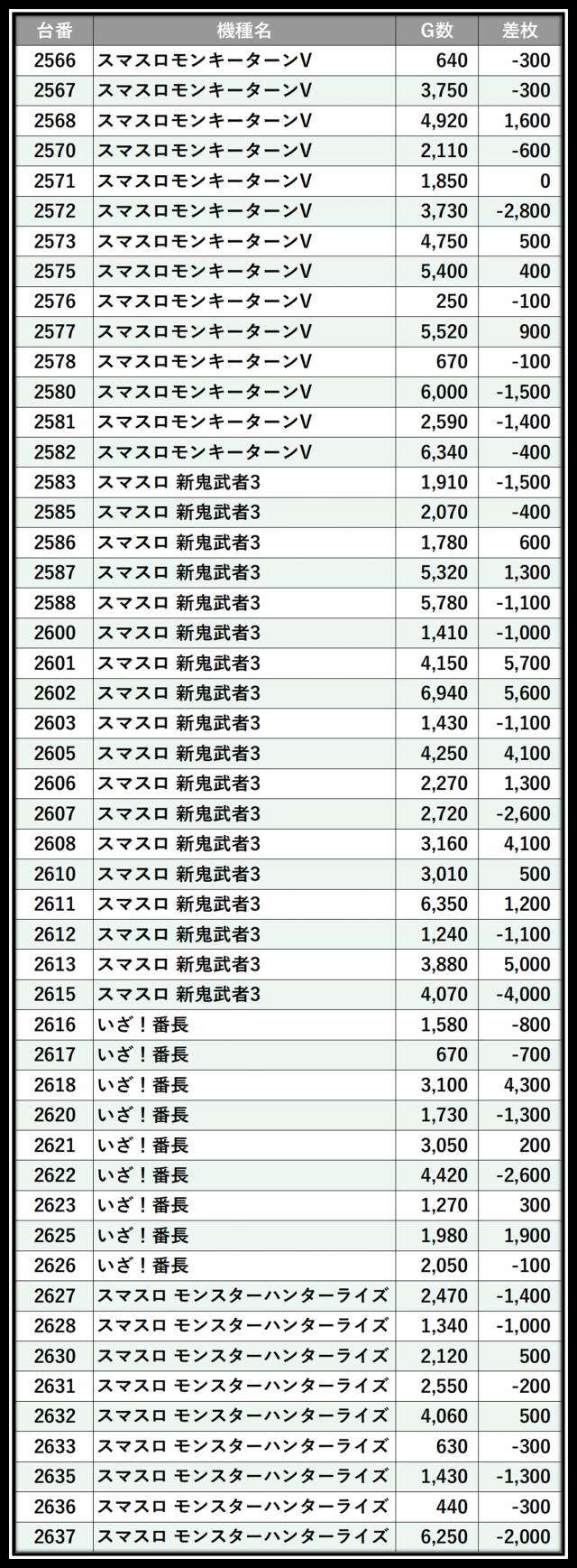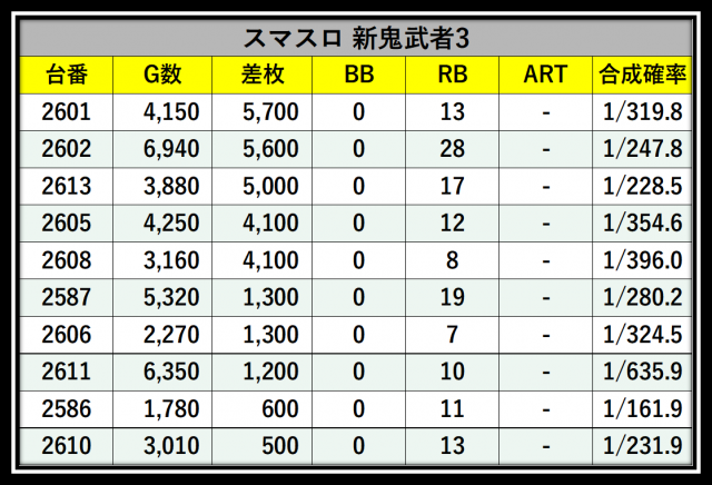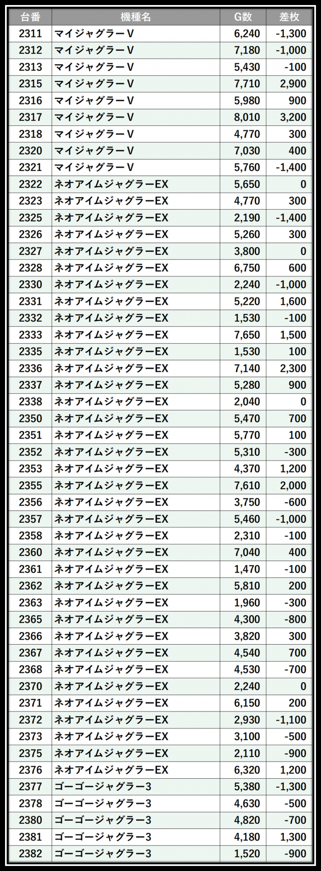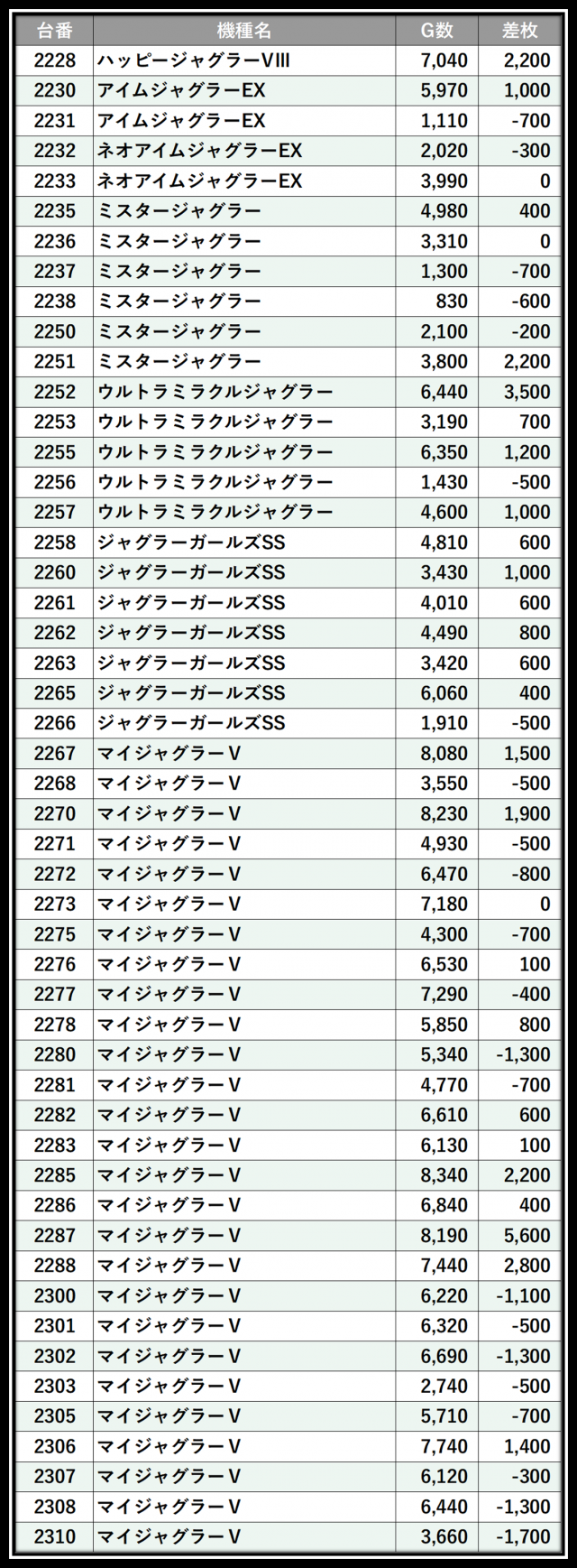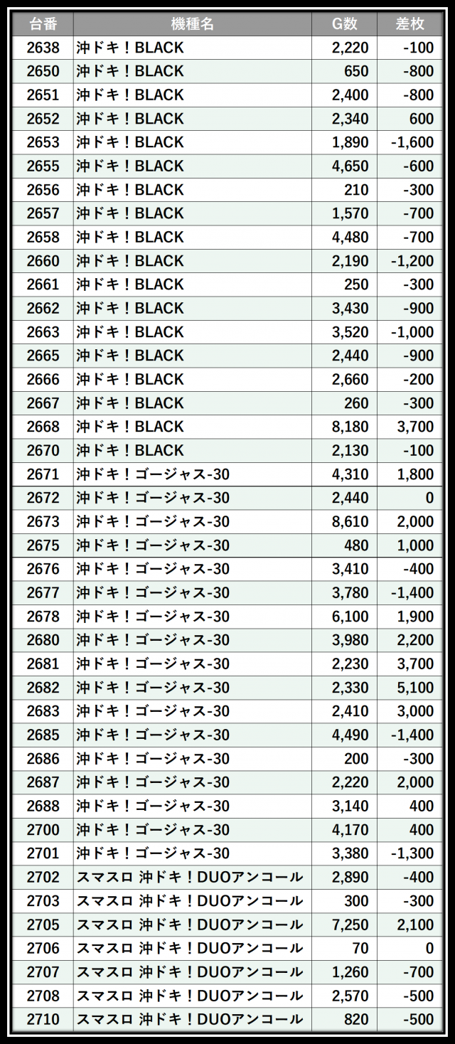 ※差枚数順に掲載しています