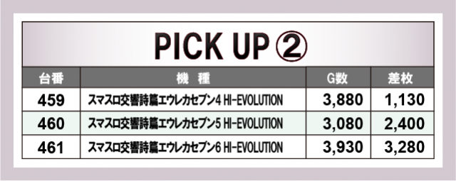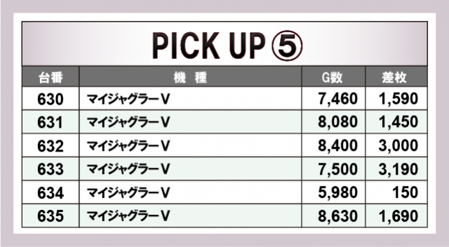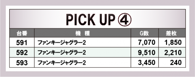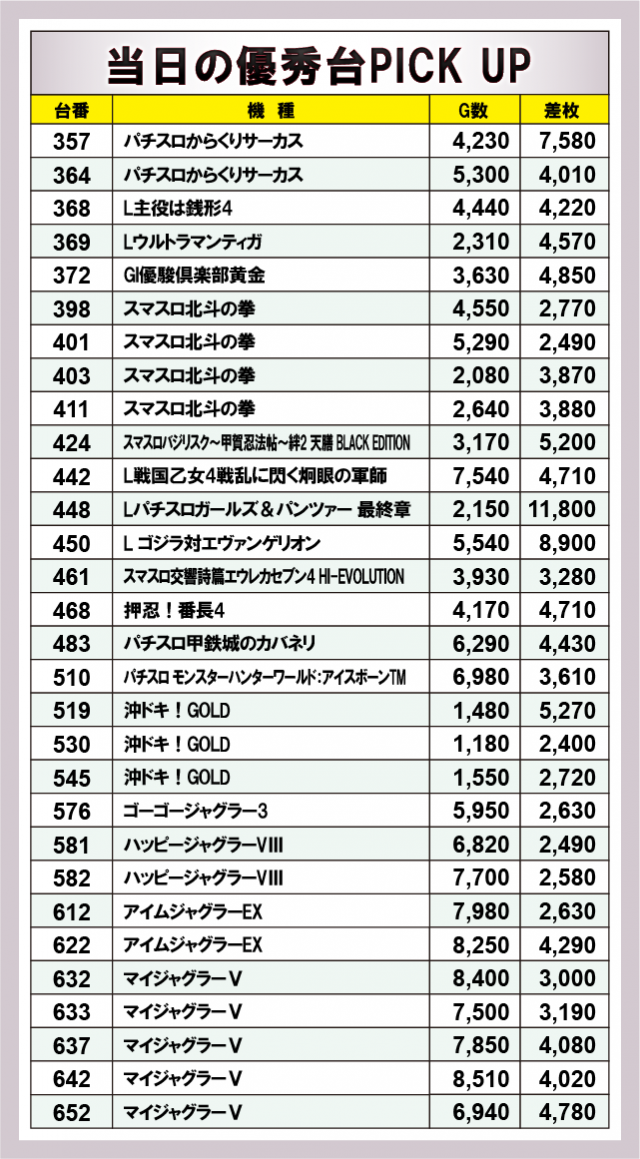 また、『ジャグラー』シリーズも多数ランクインし、ハイスペック機種からノーマルタイプまで店内にはポテンシャルを秘めた台が多く存在していたことが窺える。