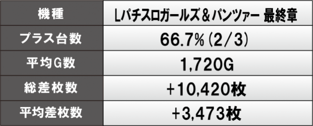 『Lパチスロガールズ&パンツァー 最終章』は好感触を掴めたエリアとなっており、まとまった出玉を獲得している様子も印象的だ。腰を据えて遊戯できたファンは、間違いないなく有意義な時間を過ごしていたことだろう。