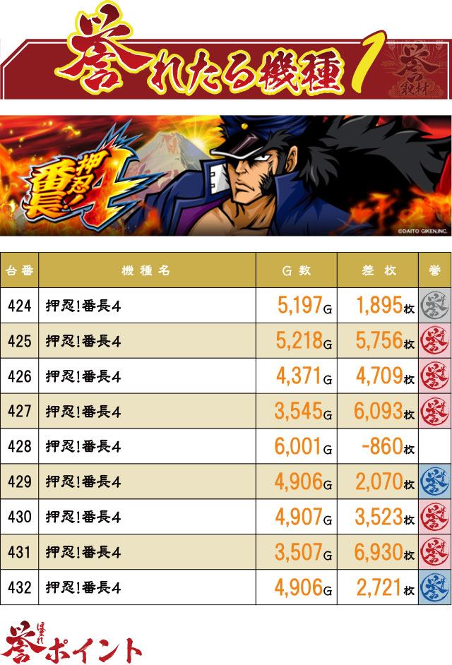 全9台設置の『押忍!番長4』の結果はご覧の通り。9台中8台がプラっていた上、誉マーキングが付くほど十分すぎる差枚結果となった。9台のうち1/3にあたる3台が+5,000枚超えという凄まじい結果!もしや全台が優秀台だった…!?