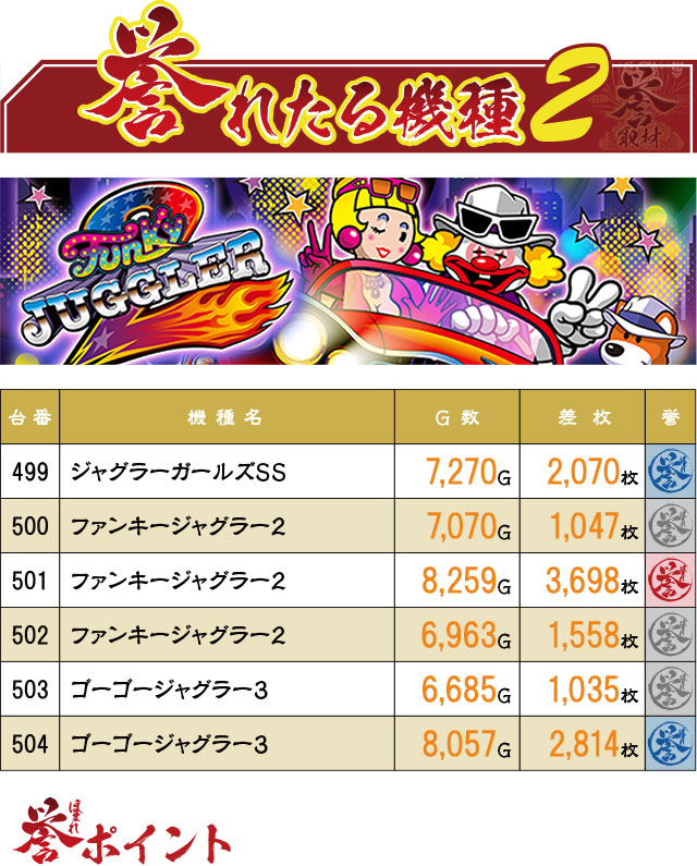 『ジャグラー』シリーズが6台並んだこちらのブロック、6台すべてに誉マークが付いていた!その中でも頭1つ飛び抜けていたのは、+3,500枚超えを実現した『ファンキージャグラー2』の501番台!