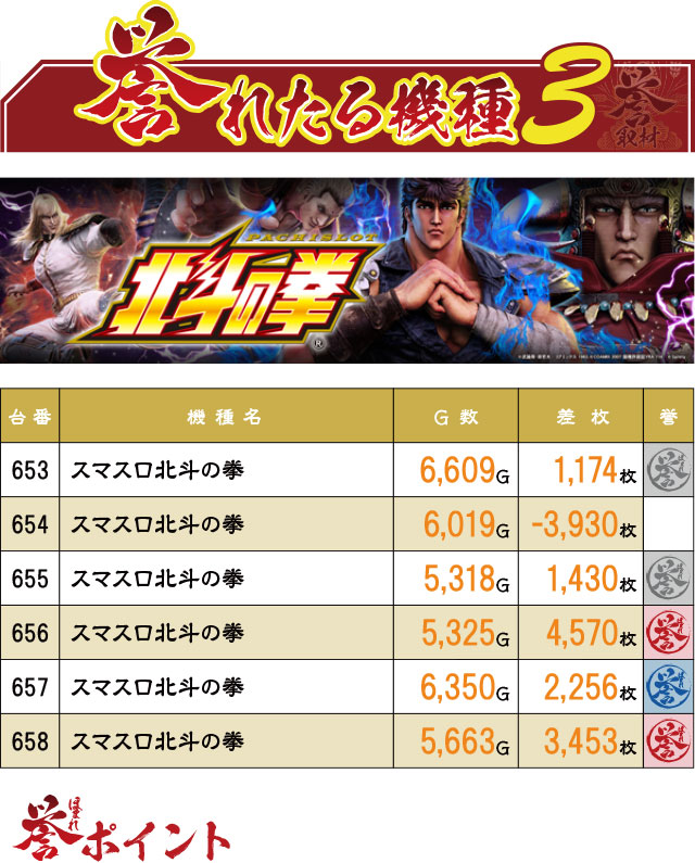 『スマスロ北斗の拳』コーナーでも6台並びで勢いづいているブロックを発見!6台並びで5台がプラス、加えてその5台すべてに誉マークあり。+3,000枚超えを示す赤誉マークも2台生まれていた。